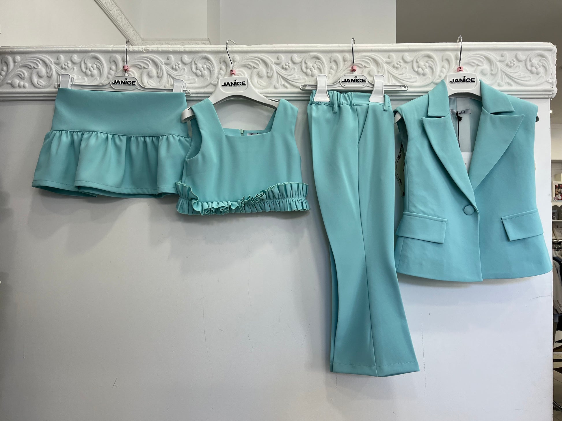Pantalone a zampa TIFFANY firmato Janice, disponibile dalla 3 alla 7 anni, nella colorazione acqua marina