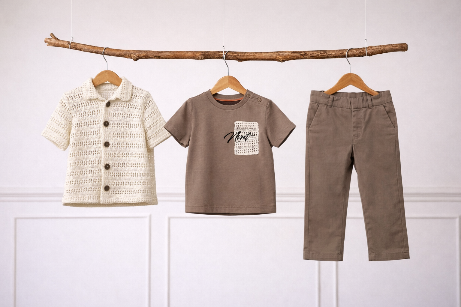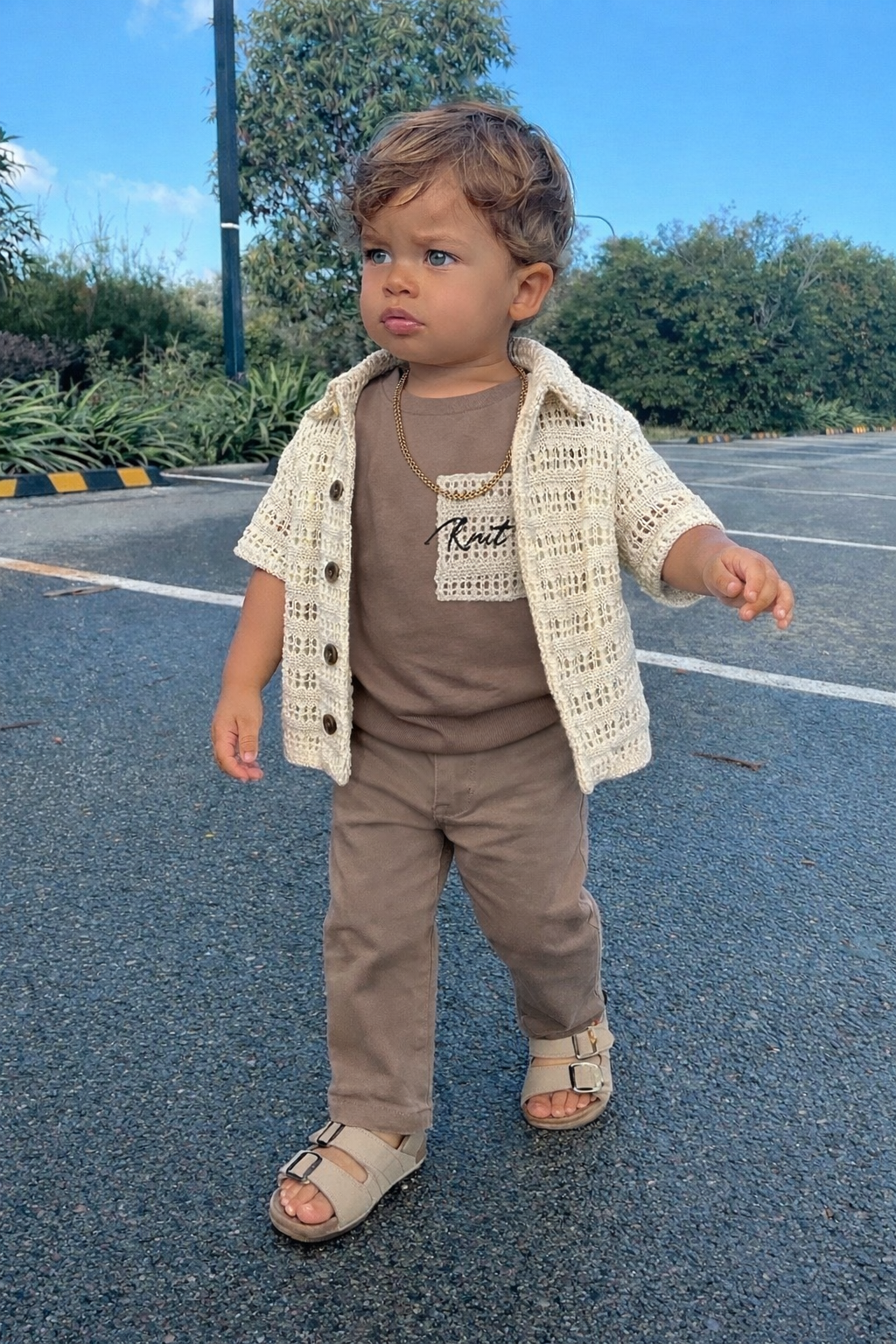 T-shirt Mykonos firmata NEVER TOO, disponibile dalla 9 mesi alla 7 anni, color fango